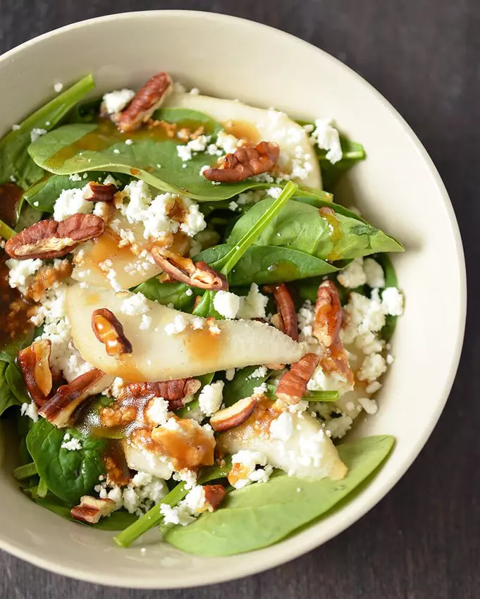 Highlight the best of the season with this endlessly variable salad. Use spinach or kale, pear or apple, feta or goat cheese, pomegranate seeds, nuts—make it your own. Finish the salad with a simple balsamic and Dijon mustard dressing.